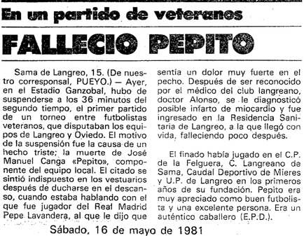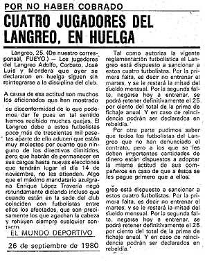 Temporada 1980/1981 : Dirige el equipo Valentín Piquero (sustituido por Calín) que en la presentación del equipo cuenta con : Adolfo, Nacho, Vallina, Santibáñez, Fernando, Llanes, Campa, Tascón, Ricardo, J. Luis, Miguel, Alberto, Manzano, Alfredo, Mortera, Pacho, Tistu, Camuel y Félix. A comienzos de esta temporada está a punto de desaparecer el equipo, pues ante las denuncias de contrato por parte de los jugadores que llevaban varios meses sin cobrar, la Federación Española de Fútbol exige el pago o si no sería eliminado de la competición y dado de baja en la Federación, después de diversas gestiones se consigue el dinero, puesto un millón y medio por el Sporting de Gijón y dos millones y medio por Eladio Praga. Los jugadores exigen la dimisión del Presidente Clavería, cosa que este admite enviando telegramas a la F.E.F y al Club. Se nombra una Gestora para dirigir al Club y el 15 de Diciembre en asamblea de socios se elige como Presidente a Honorino Montes. Se desciende a 3ª División.